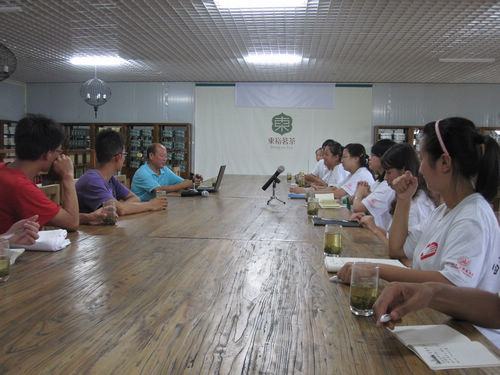 调研伊始,苏先生先为队员们介绍了公司发展史,与上次旁听推介会不同的是,此次苏先生不再着重介绍营销状况,而是从茶叶加工与包装,原料产地与品质、采摘与保鲜,销售方式与形式等多方面全方位立体介绍了东裕独特的运作方式,让我们对西乡茶叶发展现状又多了层认识。