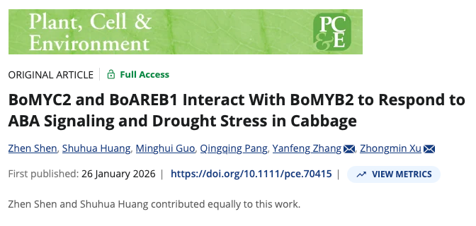 近日,我院十字花科蔬菜作物遗传改良与生物技术创新团队许忠民研究员课题组在《Plant,Cell & Environment》上发表了题为“BoMYC2 and BoAREB1 interact with BoMYB2 to respond to ABA signaling and drought stress in cabbage”的研究论文,阐明了MYB家族转录因子BoMYB2通过协同BoMYC2以及BoAREB1响应ABA信号调节结球甘蓝抗氧化能力,增强结球甘蓝抗旱性的分子机制。在读博士生沈震和陕西省杂交油菜研究中心副研究员黄淑华为论文共同第一作者,许忠民研究员和陕西省杂交油菜研究中心张彦锋研究员为共同通讯作者。