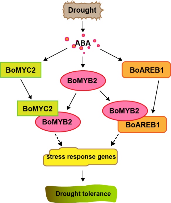 BoMYB2协同BoMYC2以及BoAREB1调节结球甘蓝干旱胁迫耐受性的分子机理模型