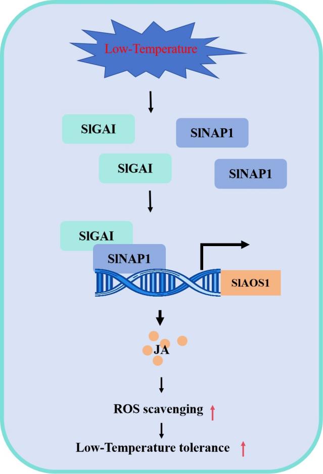 图1. SlNAP1–SlGAI–SlAOS1模块调控番茄低温胁迫模式图