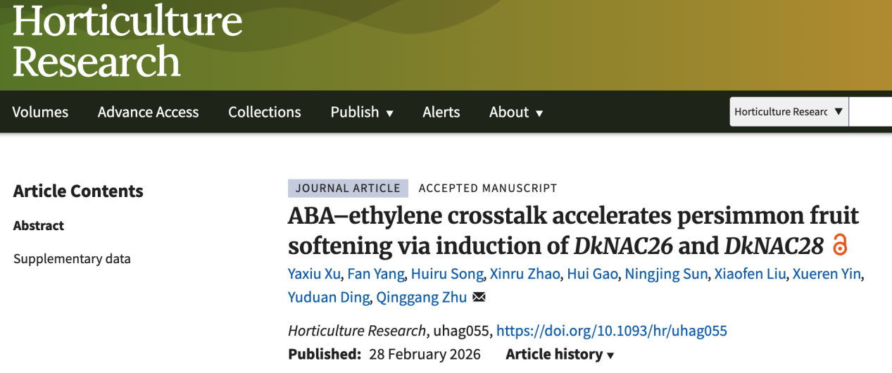 近日,采后生物学与技术研究团队祝庆刚副教授课题组在 《Horticulture Research》期刊上发表了题为 “ABA–ethylene crosstalk accelerates persimmon fruit softening via induction of DkNAC26 and DkNAC28”的研究论文。研究首次鉴定了柿子果实中两个关键的NAC转录因子 DkNAC26 和 DkNAC28,揭示了乙烯与脱落酸(ABA)之间通过相互诱导生物合成基因形成的“正反馈回路”,从而协同驱动柿子果实快速软化的分子机制。