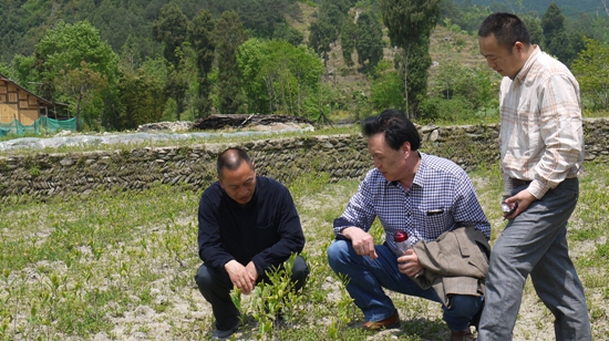 肖斌教授与宁强千山茶叶公司王有泉总经理查看“陕茶1号”在宁强县的长势