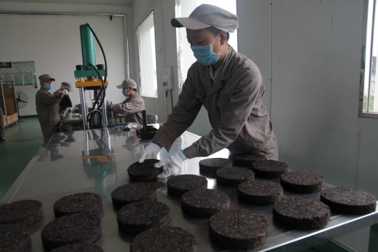 步入制茶车间,特殊的茶香扑鼻而来。车间里穿着统一工作服的工人们正在各道工序上忙碌着,一切显得紧张而有序,制茶流程需要经过选料、筛制、拌水、消毒、渥堆、压制、定型、发花、烘干等10多道工序,才可筑成一块品质优异的茯茶。