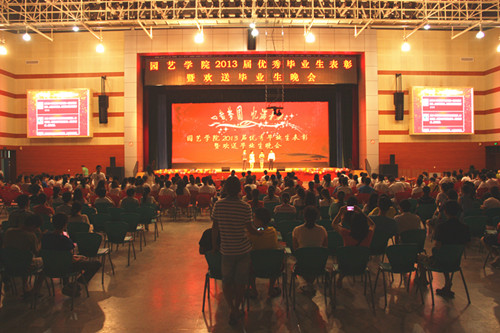 随后,毕业生晚会在舞蹈队表演的《Blow》中热烈拉开了序幕, 2009级园艺、设施农业科学与工程两个专业7个班级的毕业生们竞相登上舞台展现才艺。优雅华丽的《梦回大上海》,热辣劲爆的《95》T台秀,包含深情的《想要跟你飞》和《蒙娜丽莎的眼泪》,一起诉说着四年同窗的真挚情谊;时尚幽默的小品《甄嬛小传》、极具视觉冲击力的舞蹈《穷开心》赢得了场上毕业生的阵阵喝彩与掌声;由2009级设施2班原创的诗歌朗诵《写在离别的渡口》,表达了毕业生对母校的深切感恩与留恋;晚会现场微博墙上,滚动着毕业生与老师、毕业生之间的祝福与惜别,言词朴实感人。最后,晚会在全体毕业生联唱中圆满结束。