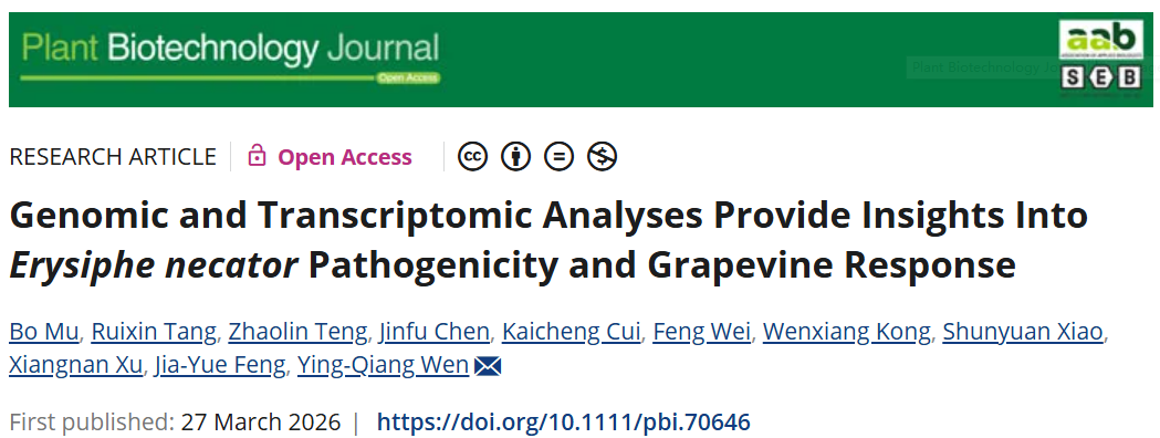 近日,西北农林科技大学园艺学院文颖强教授课题组在《Plant Biotechnology Journal》在线发表了题为“Genomic and transcriptomic analyses provide insights into Erysiphe necator pathogenicity and grapevine resistance mechanisms”的研究论文。系统揭示了葡萄白粉菌效应因子CSEP118与寄主靶标VviTrxz的互作机制。园艺学院博士穆波为论文第一作者,文颖强教授为通讯作者,西北农林科技大学为第一完成单位。