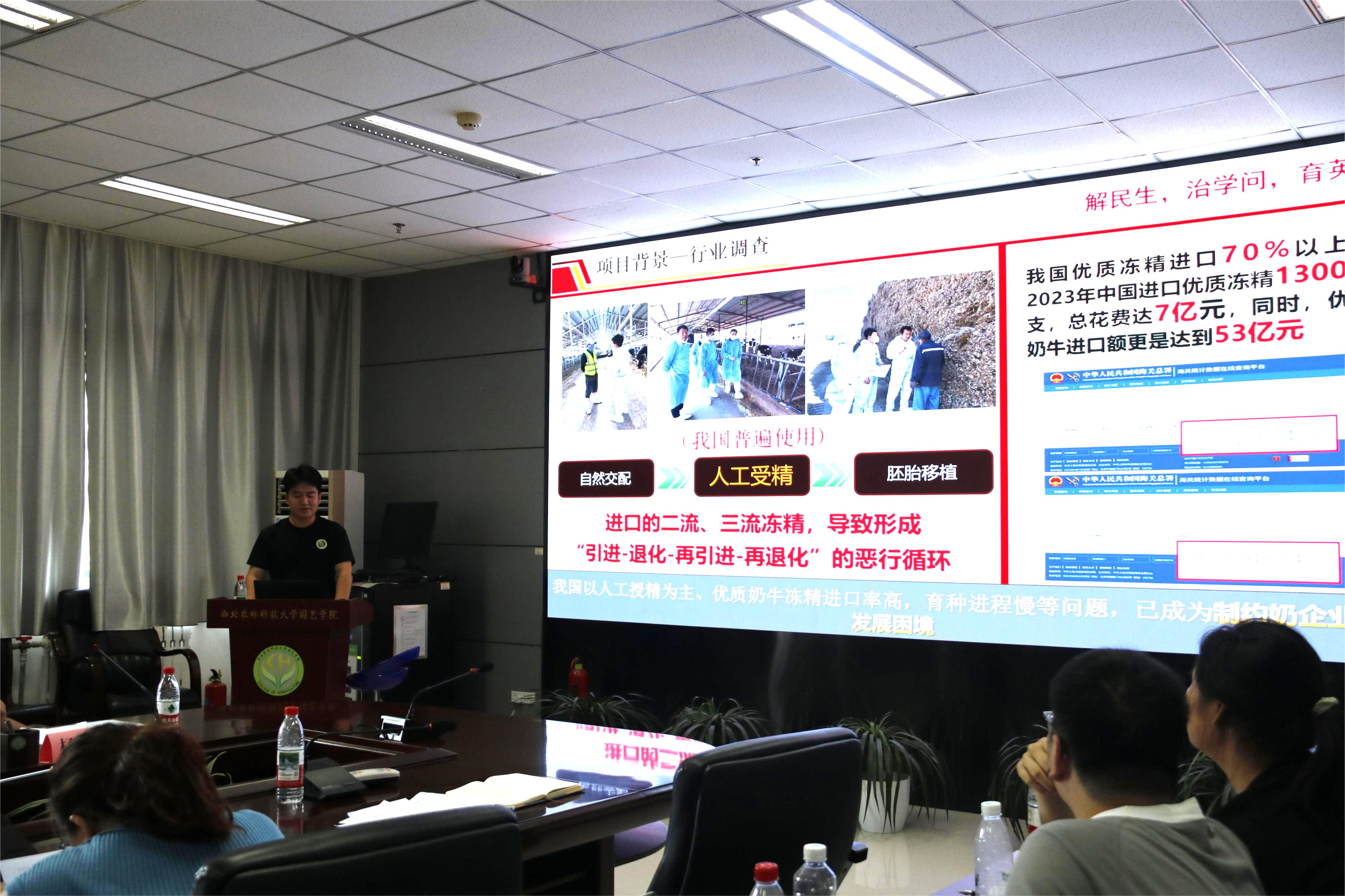 评审现场,来自资源环境学院、信息工程学院、动物医学院、动物科技学院、农学院和园艺学院等6个学院,分别依托宁陕西永寿小麦、陕西佳县红枣、宁夏灵武奶牛、陕西武功家禽、陕西泾阳蔬菜、内蒙古乌审旗生态肥业、内蒙古准格尔杂粮、陕西延安蔬菜等8个科技小院的8支参赛队伍,开展了一场别开生面的项目答辩,交流汇报科研、产业相关创新成果,集中展示科技小院为乡村发展带来的深刻变化。由试验示范站站长、科技小院首席专家、涉农企业行业导师、相关学院及部门负责人等10人组成的现场专家评审团,对参赛团队作品进行评审。其中,担任我校研究生行业指导教师、杨凌众创田园公司业务主管左文革对各参赛团队项目给出中肯意见和建议,在参赛文本撰写、路演PPT制作美化和现场展示、项目证明材料提供等方面进行了针对性的详尽点评。园艺学院副书记胡代欣围绕“解民生、治学问”赛事主题,强调各参赛团队要聚焦项目核心内容,突显实力、展示亮点,加入案例应用效果,增加参赛权重。园艺学院副院长李征希望大家珍惜本次参赛机会,鼓励队员增强自信,充分展现西农学子知农爱农的情怀与专业能力。后期,杨凌众创田园公司将为参赛队伍备战赛事提供有力的技术支撑和项目打磨。